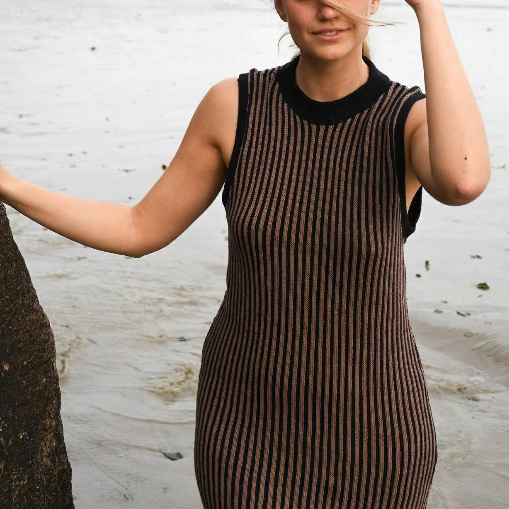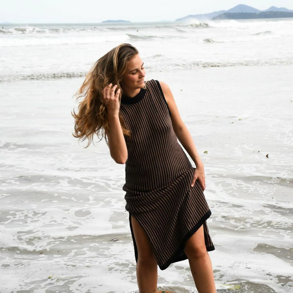 Este vestido lleva ese mismo espíritu libre: fuerte, auténtico y con una personalidad que no se doma. Su escote redondo y cuello media polera marcan una silueta contemporánea, mientras que las sisas amplias y las aberturas laterales le aportan movimiento y frescura.